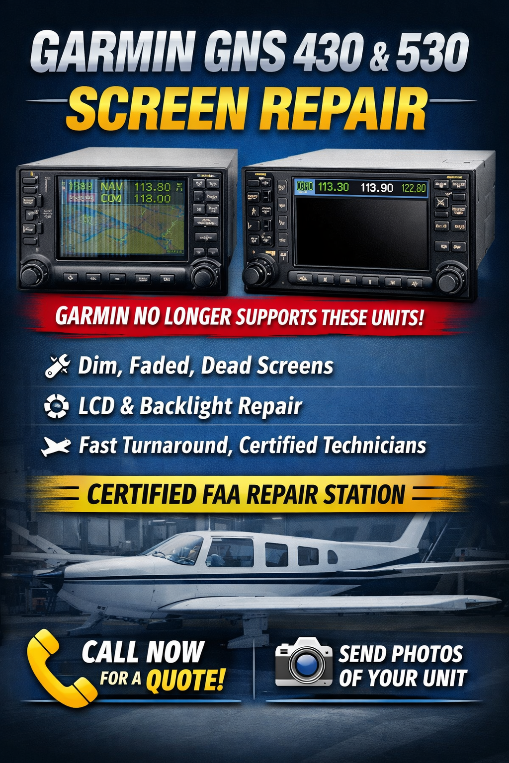 Garmin • GNS 430 • GNS 530 • GPS Repair • Screen Replacement • Display Repair • FAA Certified • Avionics Repair • Backlight Repair • Bench Testing • Diagnostic Service • Garmin GPS Service • Aircraft Panel Repair